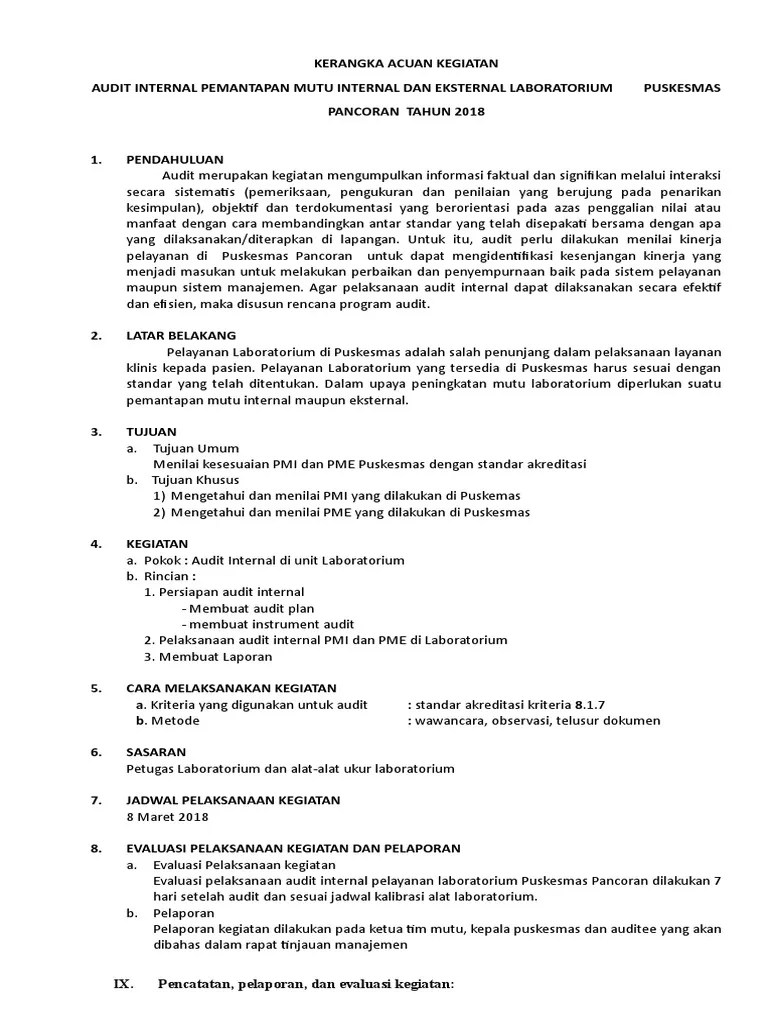 Dilaksanakan oleh organisasi sendiri untuk tujuan organisasi sendiri, contoh internal audit. 2.2 tujuan khusus audit internal laboratorium contoh: Berdasarkan laporan hasil audit yang dibuat oleh tim auditor, pimpinan pnj. Contoh, kuis, uts dan uas. 5.1.6 menyampaikan laporan pelaksanaan audit mutu internal kepada.