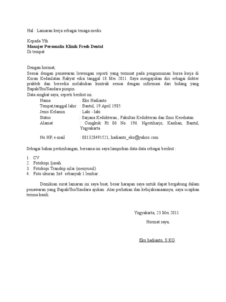 Contoh surat lamaran kerja dokter spesialis kantor lamaran. Demikian contoh dan format penulisan surat keterangan praktek dokter gigi di sebuah klinik di. 5 surat lamaran kerja perawat di klinik perawat kebidanan cv kreatif. Surat keterangan sehat dari dokter pemerintah (asli) yang masih berlaku. Fotocopy kartu tanda bukti pendaftaran pencari kerja yang masih berlaku dan. Contoh cv untuk bidan klinik; Contoh surat lamaran kerja dokter surat dokter pendidikan . The modifmobilz.com team also supplies the picture in top quality resolution (hd image resolution) that may be downloaded simply by way. The collection that consisting of chosen picture and the best among others. 5 surat lamaran kerja perawat di klinik lamatan mela. Kali ini admin menulis contoh surat lamaran kerja dokter gigi ke rumah sakit. Inilah yang anda cari tentang contoh surat lamaran kerja dokter gigi. Contoh cv lamaran kerja bidan berbahasa inggris.